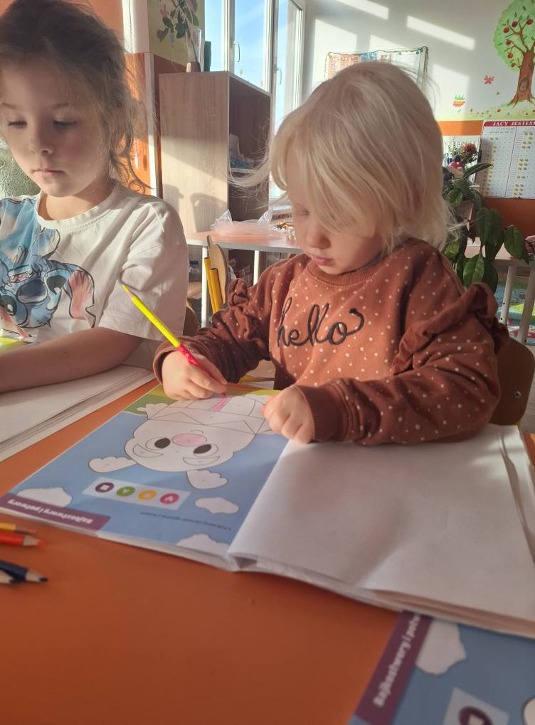 Dzieci z ogromnym zaangażowaniem składały papierowe kształty, doskonaląc przy tym swoją sprawność manualną i motorykę małą. Powstały prawdziwe papierowe dzieła sztuki! 🦋🌸
