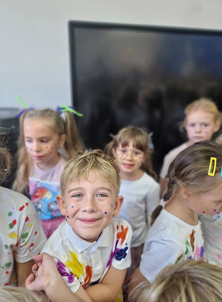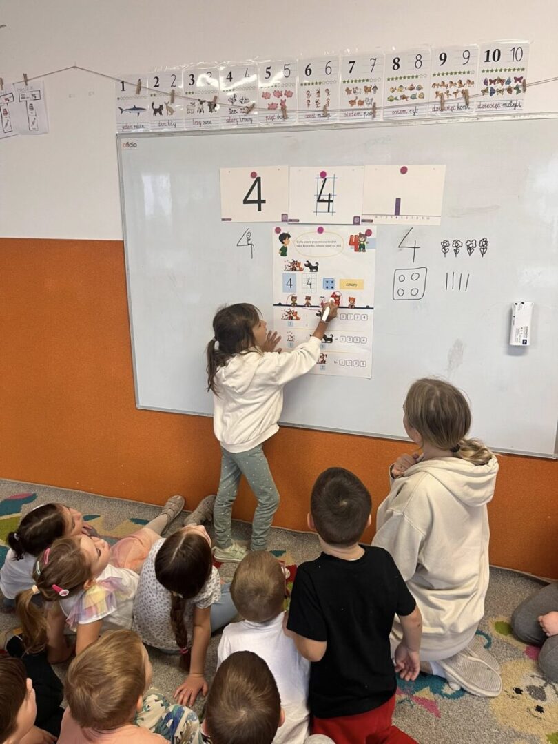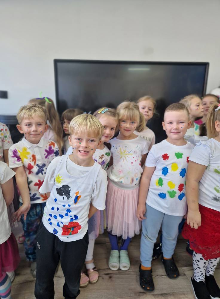Ten symboliczny znak ma nam przypominac, aby dostrzegac w dzieciach ich pasje i wspierac je w rozwijaniu talentów. Kropka ma być jedynie punktem wyjścia – początkiem drogi, która prowadzi do osiągniecia celu. Dlatego Misiaki stworzyły dziś grupowe drzewo talentów, które będzie naszym odniesiem do kolejnego tematu tygodnia 🤩 Poza tym przedszkolaki przypomniały sobie historie Vashti, wysłuchały piosenki i opowiadania o kropkach, które mogą stać się wszystkim, czym tylko zapragną, dokończyły swoje portrety kropkowymi włosami oraz stworzyły kreatywne prace plastyczne z kółek, stosując się do instrukcji ⚪️🟠🟤🟣✂️🖍️🥰 Nie zabrakło nam też konkursu w grupach na największą ilość narysowanych kropek oraz kropkowych zabaw integracyjnych ☺️