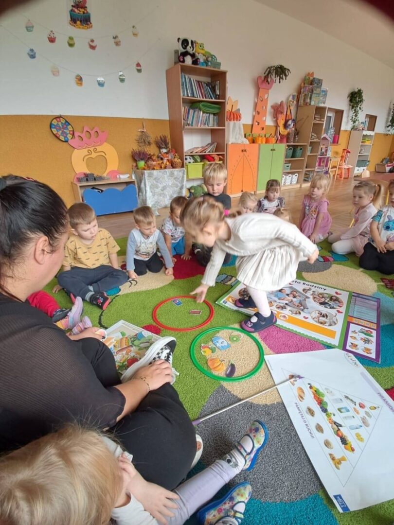 .Dzieci poznawały jesienne warzywa i owoce podczas zabaw językowych – układały warzywne zdania, pracowały z wierszem Juliana Tuwima „Warzywa” oraz wyszukiwały literę O, o w tekstach. Wspólnie bawiliśmy się w zabawy słownikowe, rozwijając zasób słownictwa. Na zajęciach matematycznych Biedronki liczyły kasztany i rozwiązywały jesienne zadania, a w książkach utrwalały swoje wiadomości. Podczas zajęć plastycznych powstawały piękne prace przedstawiające warzywa, oraz Drzewo jesienne 🍎🥕. Nie zabrakło także praktycznych działań – dzieci samodzielnie przygotowały pyszną i zdrową sałatkę owocową, dzięki której utrwalały znajomość głoski O,, a przy okazji uczyły się współpracy oraz zdrowego odżywiania 🥗🍇🍊.